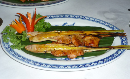 レモングラスを串代りにして牛肉をすり身にして 巻きつけ炭火で焼いたBo Lam Chao |